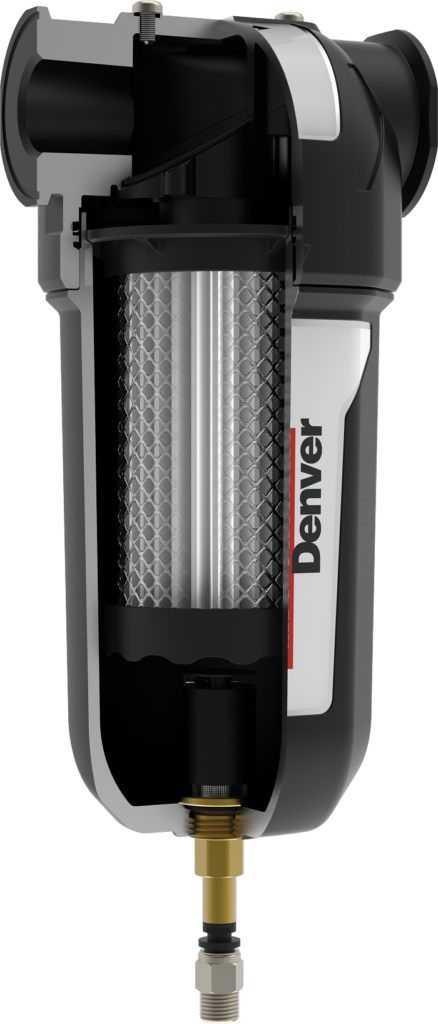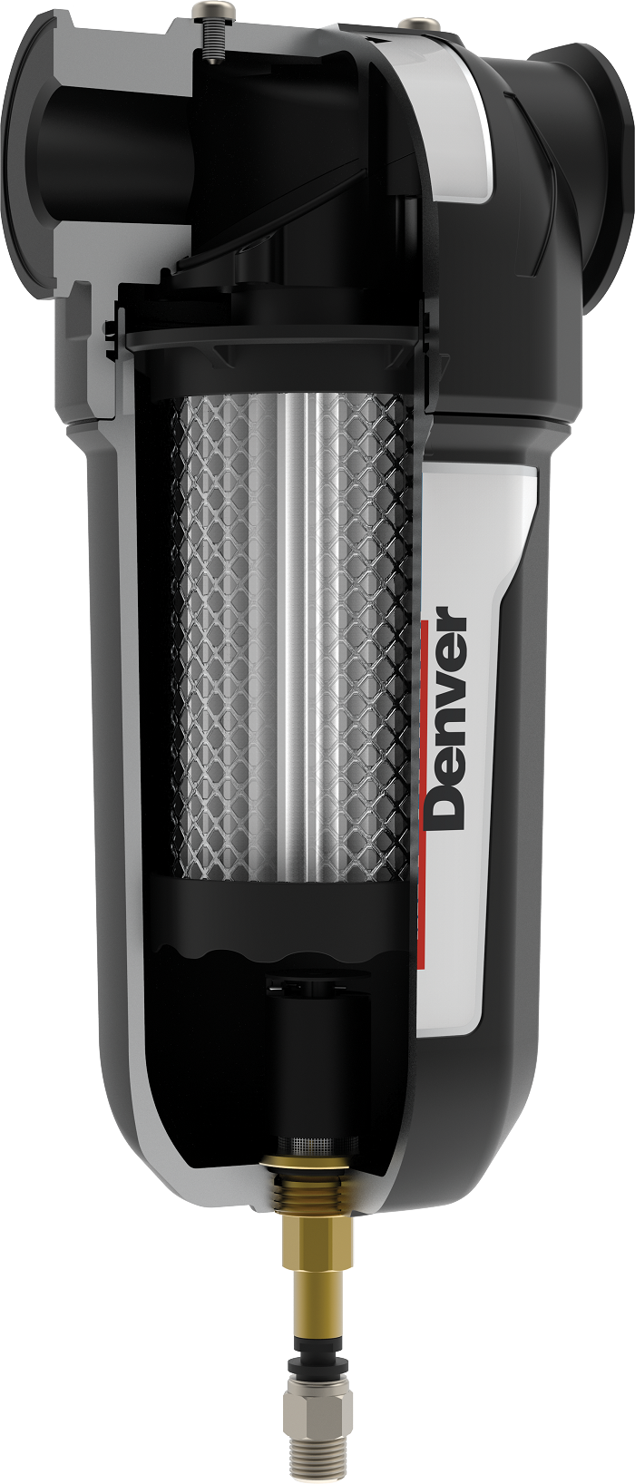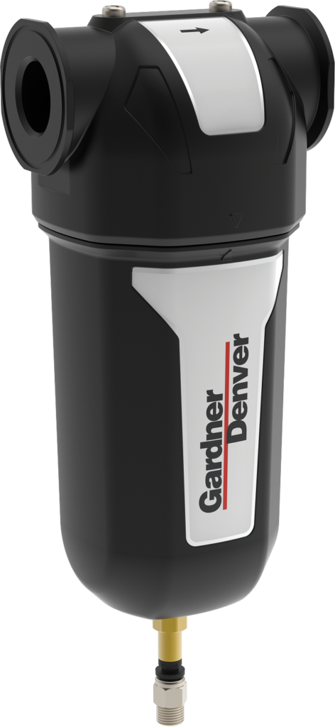 P-filtret är första linjen i stamledningen. Det fångar damm och rost ner till cirka 1 mikron och stoppar vattendroppar som annars skulle orsaka korrosion och igensättning senare i systemet. Syftet är att skydda tork och finare filter så att tryckfall och underhåll hålls nere. P-filterhusen är i gjuten aluminium och har manuell dränering för att enkelt tömma uppsamlad kondens.