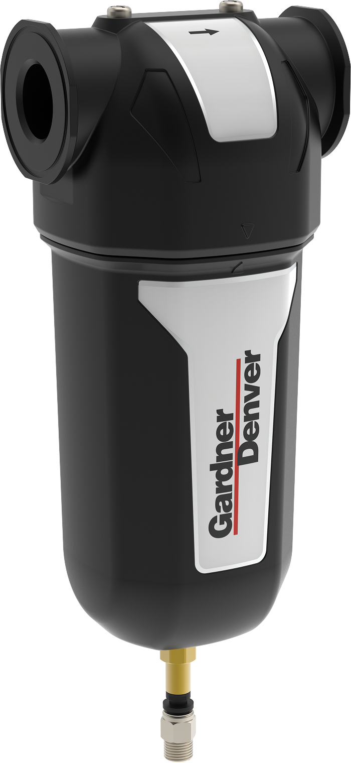 G-filtret kliver in när du behöver renare luft än vad ett grovfilter kan ge. Det fångar partiklar ner till 0,1 mikron och koalescerar vatten och oljedimma till större droppar som kan dräneras. Efter ett korrekt dimensionerat G-filter är resterande oljeaerosol högst 0,03 mg per kubikmeter vid 21°C. Precis som P sitter det i ett gjutet aluminiumhus med manuell dränering.